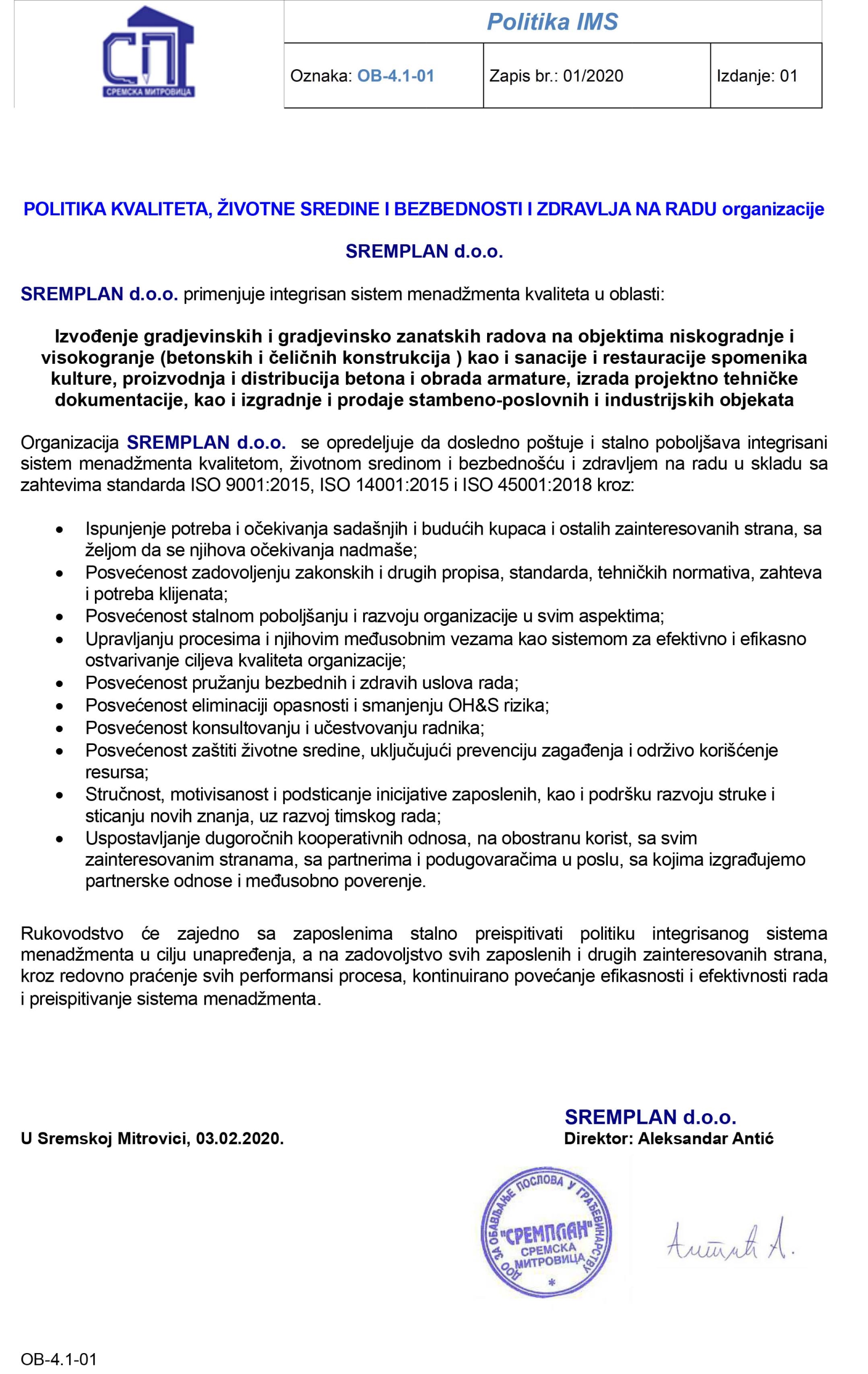 ПОЛИТИКА КВАЛИТЕТА, ЖИВОТНЕ СРЕДИНЕ И БЕЗБЕДНОСТИ И ЗДРАВЉА НА РАДУ